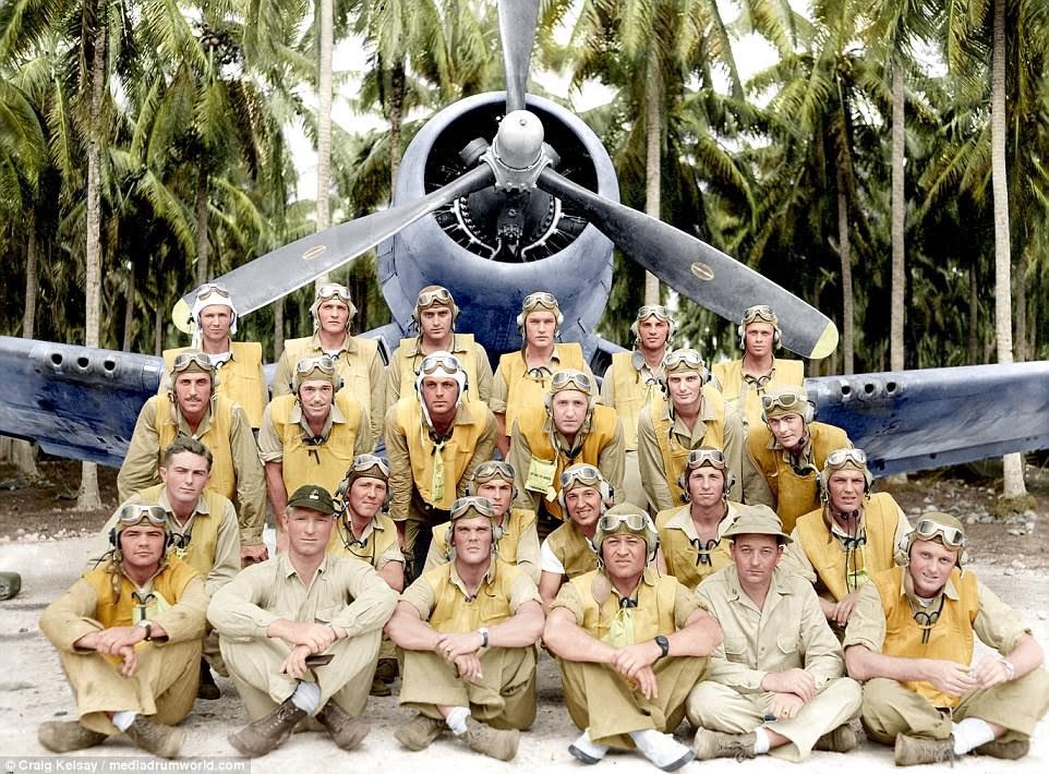 Colonel Gregory “Pappy” Boyington bottom row, fourth from the left wears the USN issues deck shoes