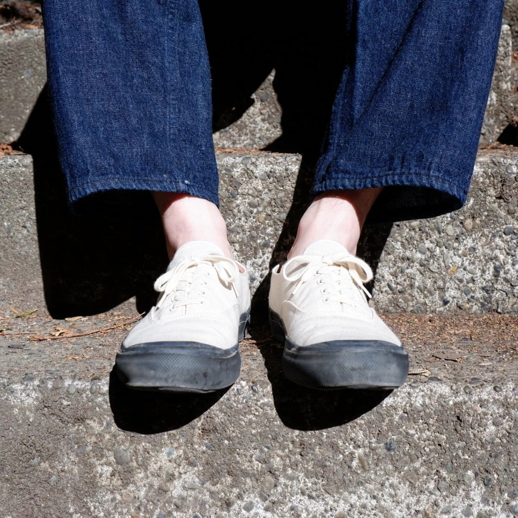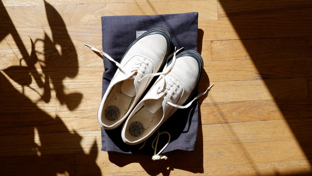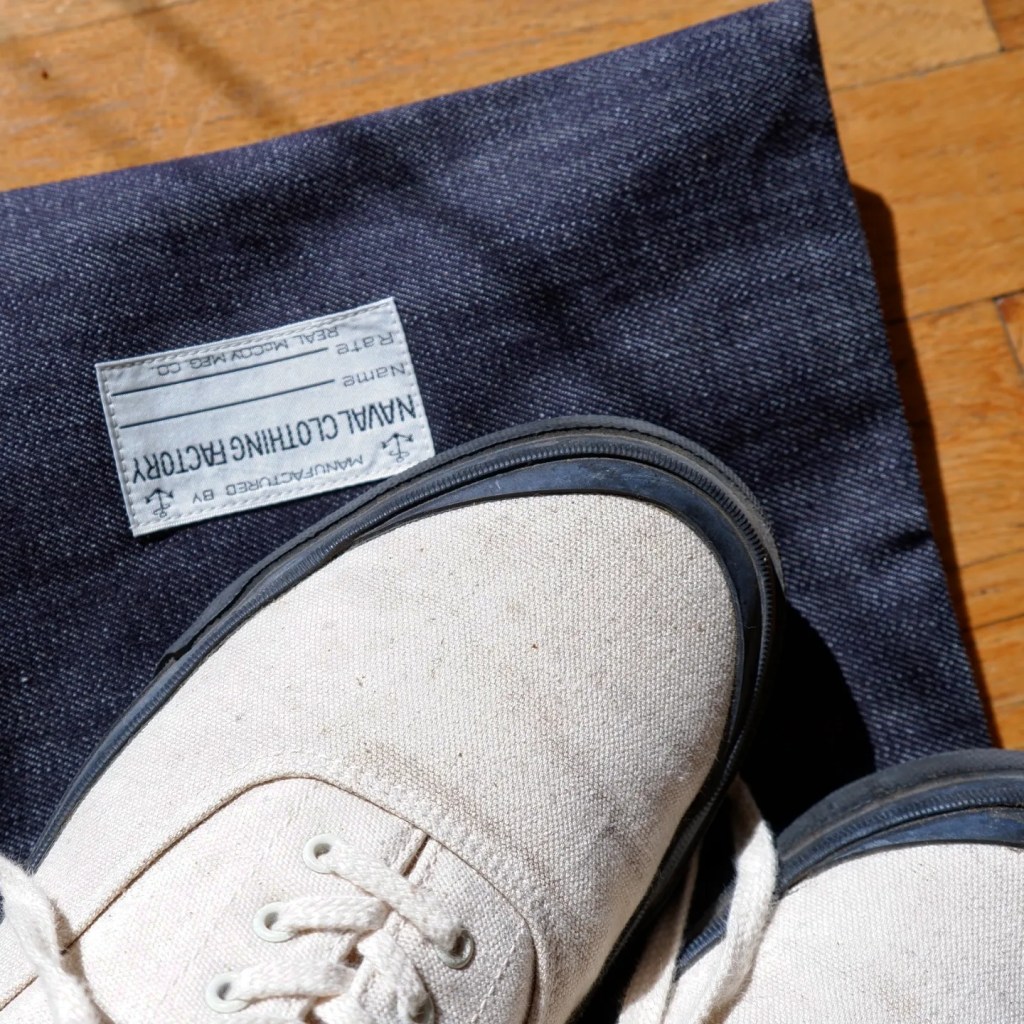 The shoes themselves are extremely comfortable. My feet are narrow and I feel they fit extremely well without any slippage with the sizing I went with. The first couple of times I wore them without socks they destroyed my heels and gave me blisters, which is expected, but after a few more wears they easily broke in and are now my third most comfortable shoe. I haven’t ran into any wet conditions with these yet, but as far as I can tell the grip on the sole is pretty solid. I’ll have to try them with the winter weather and see if they still hold up. This is more of a personal note, but I think they also look good with almost everything in my wardrobe. They are essentially the reverse color code of a traditional Chuck Taylor Converse shoe (the black & ecru) so they are versatile in this sense. I can throw them on with mostly everything and they fit well as a default ecru and black as they don’t clash with colors. The construction of the shoe itself is really great, too. I’m biased when it comes to Real McCoy’s as I’ve never had issues with anything I’ve bought made by them, even second-hand. The soles are constructed well and there are no ‘sloppy’ areas with the glue they used for the soles. The stitching is also pristine. Apparently they were completely custom made for the Real McCoy’s and in true McCoy’s fashion they did not specify who made them, although they are made in Japan. I won’t go into detail with the eyelets and the shoe laces but they are great as well. The ecru canvas they used to make the shoe itself seems very sturdy and haven’t creased much at all in the two months of wear – they obviously dirty easy, but they’ll be easy to clean. McCoy’s even went as far to include the deck shoes in a small denim canvas bag as they were issues to sailors in the 1940’s when they were originally made. These details make the shoes even more special to me and is a huge reason why I wanted these specific repros in the first place.